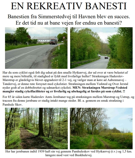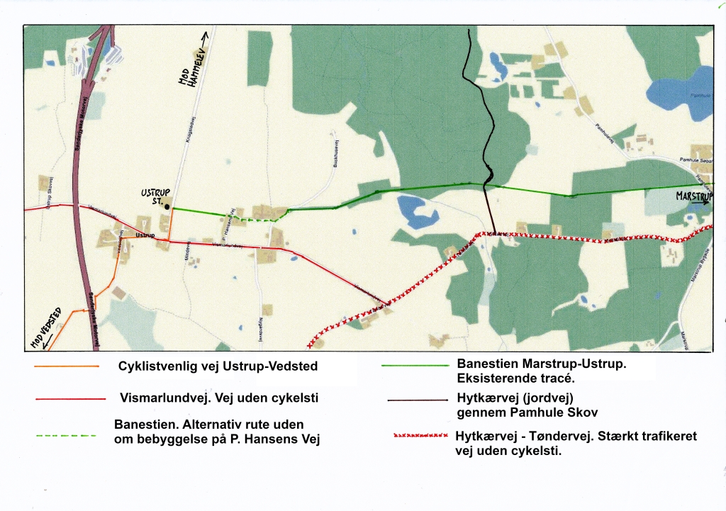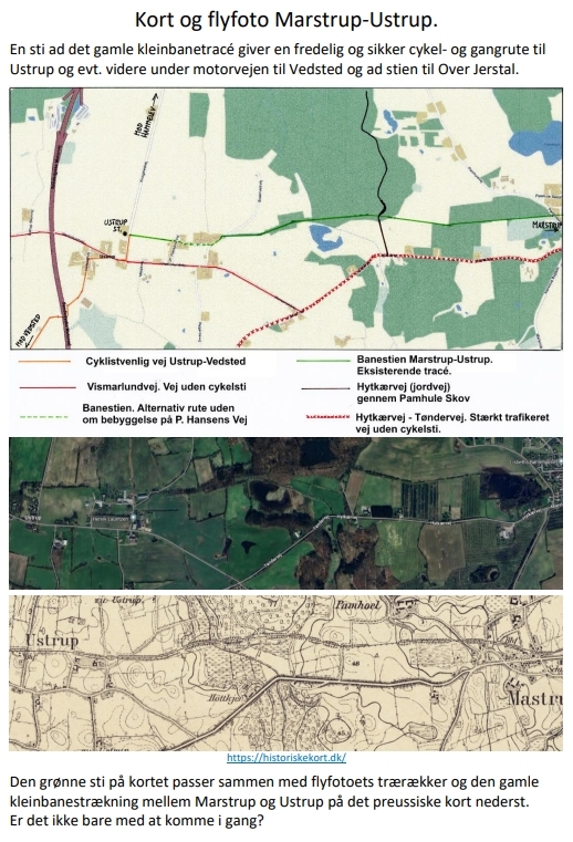 Der er stort behov for en god og sikker cykelstiforbindelse mellem Marstrup og Vedsted. Cyklistforbundet foreslår at benytte det eksisterende kleinbanetracé mellem Marstrup og den tidligere Ustrup Station, Knagsledvej 16, som en del af ruten. Videre ad Knagsledvej til Vismarlundvej og Humlevej og til Vedstedvej\/Ustrupvej under motorvejen til Vedsted. Strækningen mellem Ustrup og Vedsted fungerer stort set som cykelsti, da der er lukket for biltrafik under motorvejen. En cykelsti ad kleinbanetracéet vil både tilgodese hverdagscyklister på strækningen Marstrup-Ustrup-Vedsted og rekreativ cykel-og gangtrafik med fine forbindelser til Pamhule Skov.