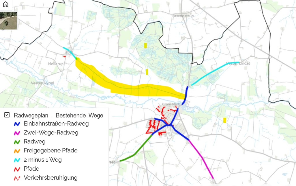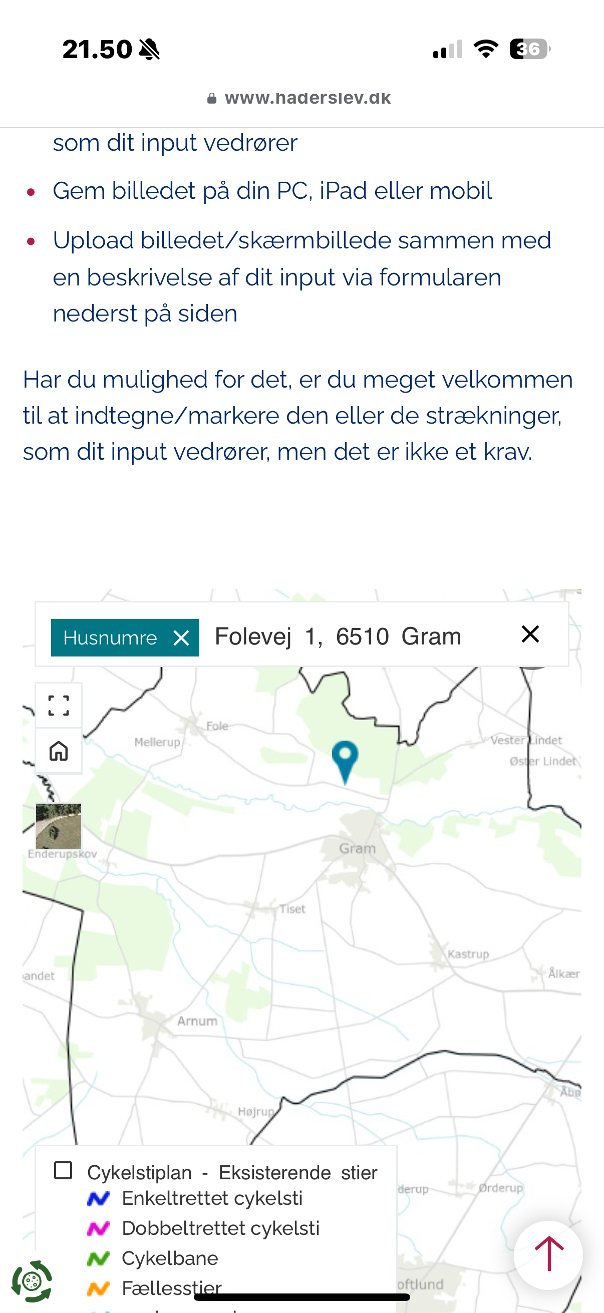 På kortet nedenfor kan du se allerede eksisterende stiforbindelser i Haderslev Kommune. Vi håber, at du vil bruge kortet til at udpege, hvilket område dit forslag vedrører. Du kan desværre ikke gemme inputs i vores kortløsning, men vi håber, at du vil tage et billede/screenshot af det område, som dit input vedrører og uploade det til os via formularen nederst på siden.