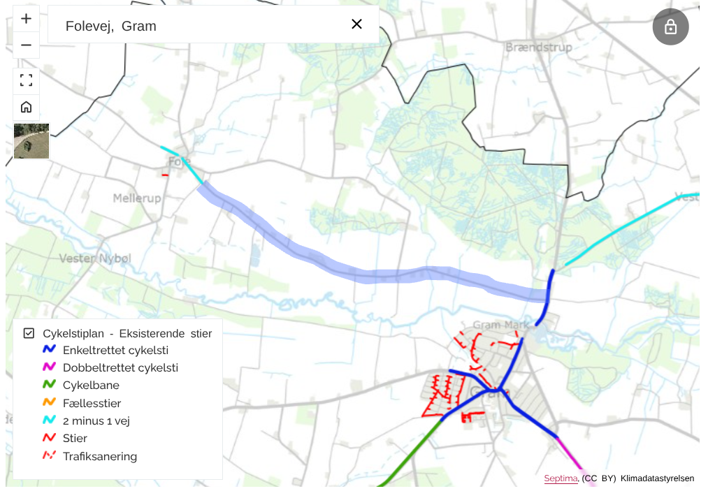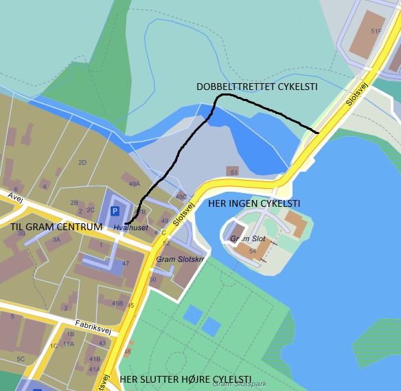 Cykelforbindelser i landdistrikterne Haderslev Kommune arbejder på at fremme mobiliteten i landdistrikterne og forbedre transportmulighederne for cyklister. Frem til den 30. september 2025 kan du komme med input til, hvor du mener, der kan etableres endnu flere gode cykelforbindelser. Dobbeltrettet cykelsti mellem Gram og Brændstrup Haderslev Kommune anlægger sammen med Vejen Kommune en dobbeltrettet cykelsti langs Slotsvej og Låsledvej mellem Gram og Brændstrup. Cykelstien skal medvirke til at højne sikkerheden og trygheden for cyklister på strækningen. Forkert overskrift, der anlægges en dobbeltrettet cykelsti mellem Vester Lindet Vej og Brændstrup. Cykelforholdene fra Østervej i Gram, hvor højre cykelsti stopper, og forbi Gram Slot er ikke løst. De snævre vejforhold og sving forbi Gram Slot er ikke egnet for cyklister, bemærk her er ingen cykelsti. Området højner ikke sikkerheden og trygheden for cyklister. Fra Gram slot og til Gram gård er der en enkeltrettet cykelsti i højre side, som hovesalig bliver brugt som gangsti, Ved angementer på Gram Slot er det umulig at cykle på stien på grund af fodgænger, Cyklister er således henvist til vejen, hvor der er meget biltrafik, samtidig. Der opfordres til at man løser cykelproblemet i dette område, før der sker uheld og i værste fald personskade. Det foreslås, at den dobbeltrettede cykelsti føres fra Brændstrup og til Åvej i Gram, se skitse. Egon Majlund Gram Fokusgruppe Sankt Vincents Vej 3, 6510 Gram