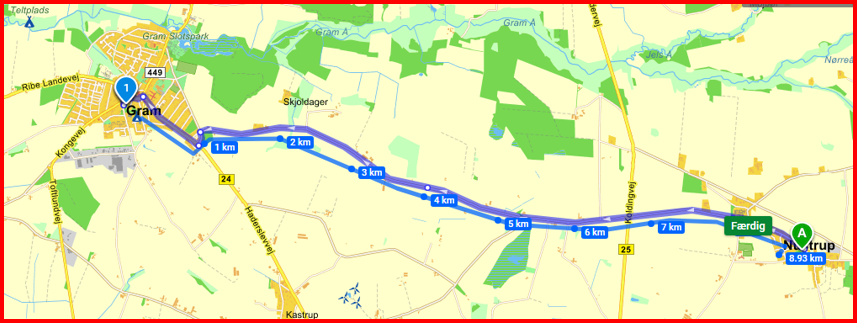 Folevej (Fole-Gram) - Ribe Landevej (Gram-Gelsbro) - Kongevej (Tiset-Arnum) - Haderslevvej fra (Kastrup, Skibelundbjergvej, Skibelundvej (Gram-Nustrup)