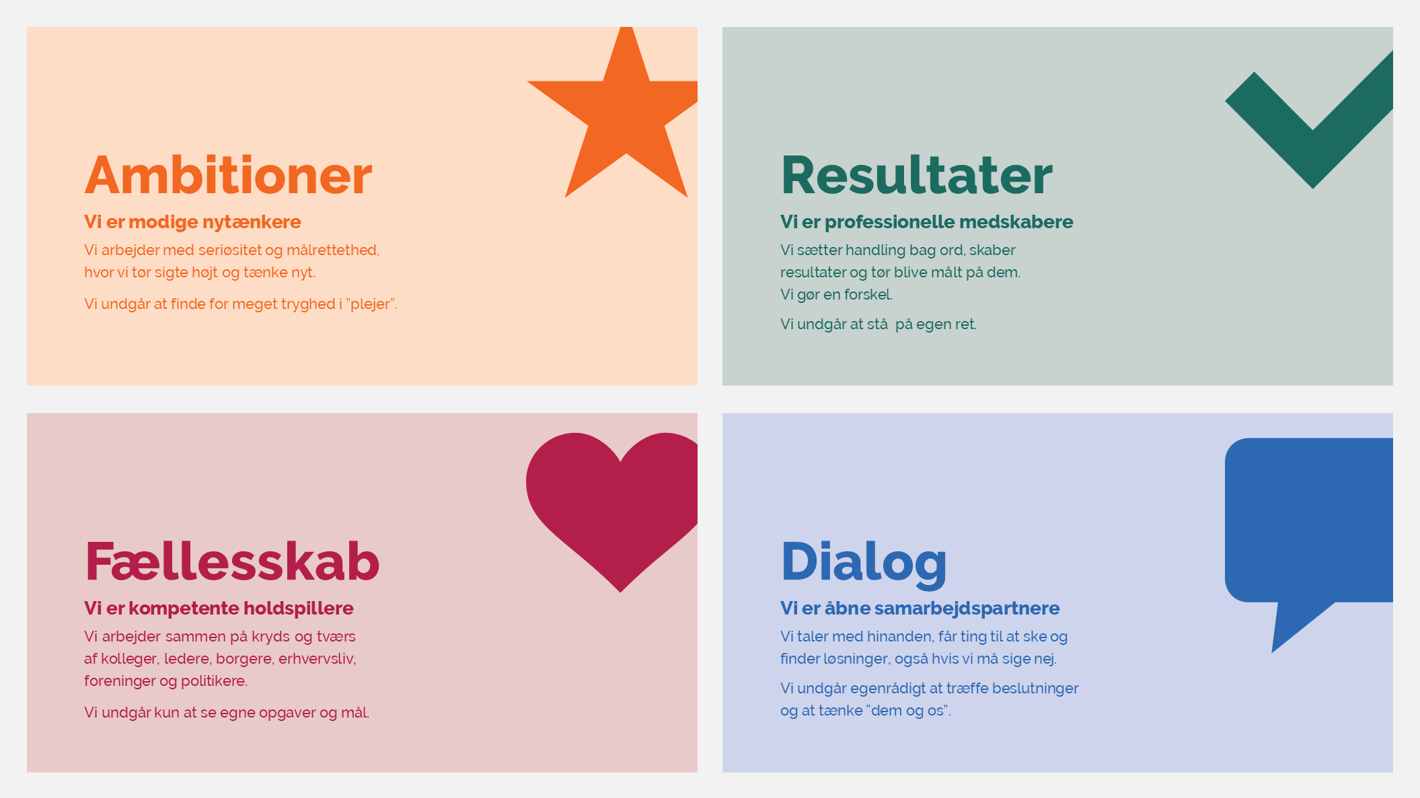 I hverdagen arbejder vi ud fra vores fire værdier: Ambitioner, resultater, fællesskab og dialog.