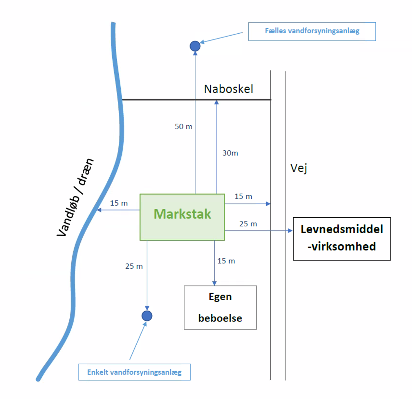 Markstakke skal placeres, så nedenstående afstandskrav overholdes, jf. §8, stk.1 i Husdyrbrugsloven: